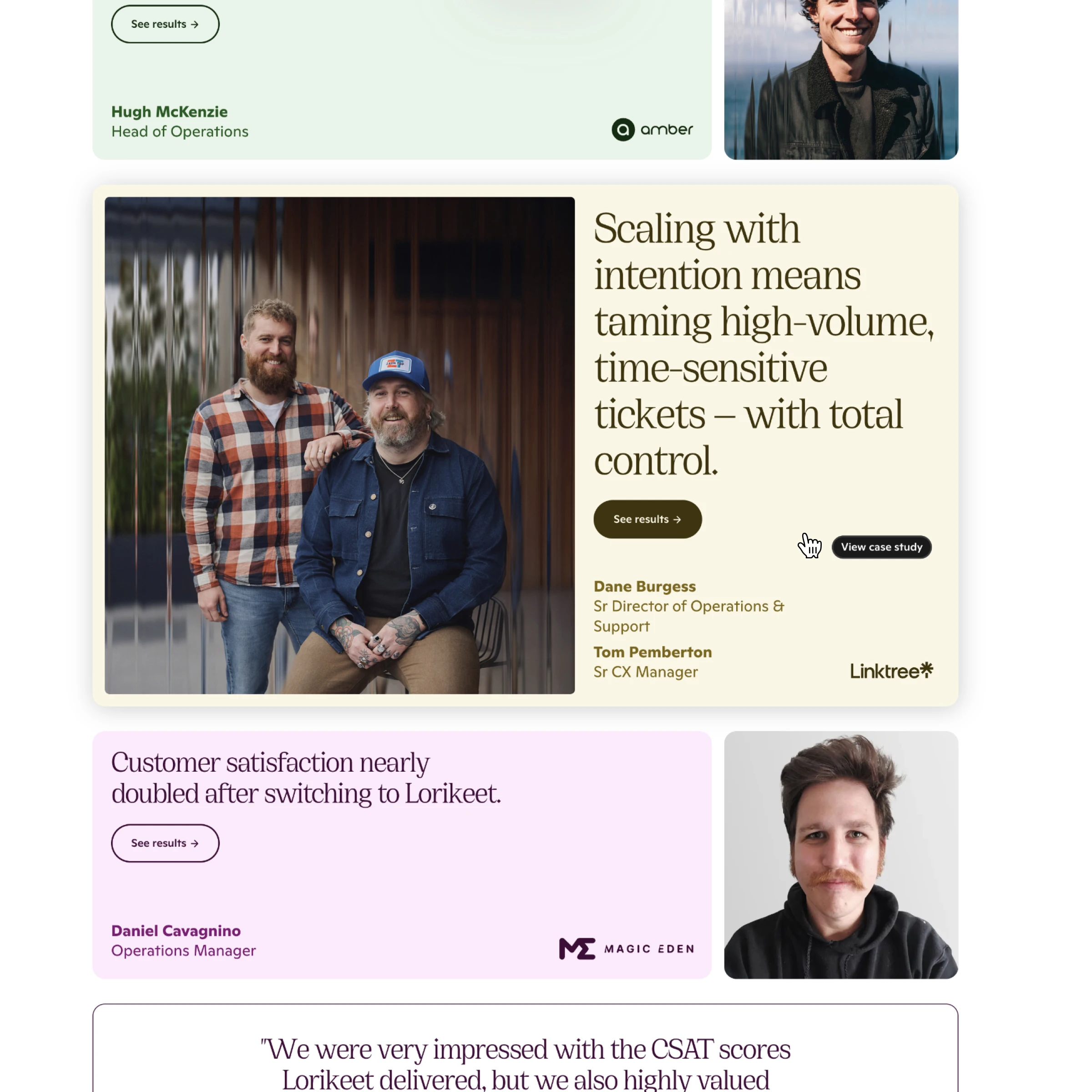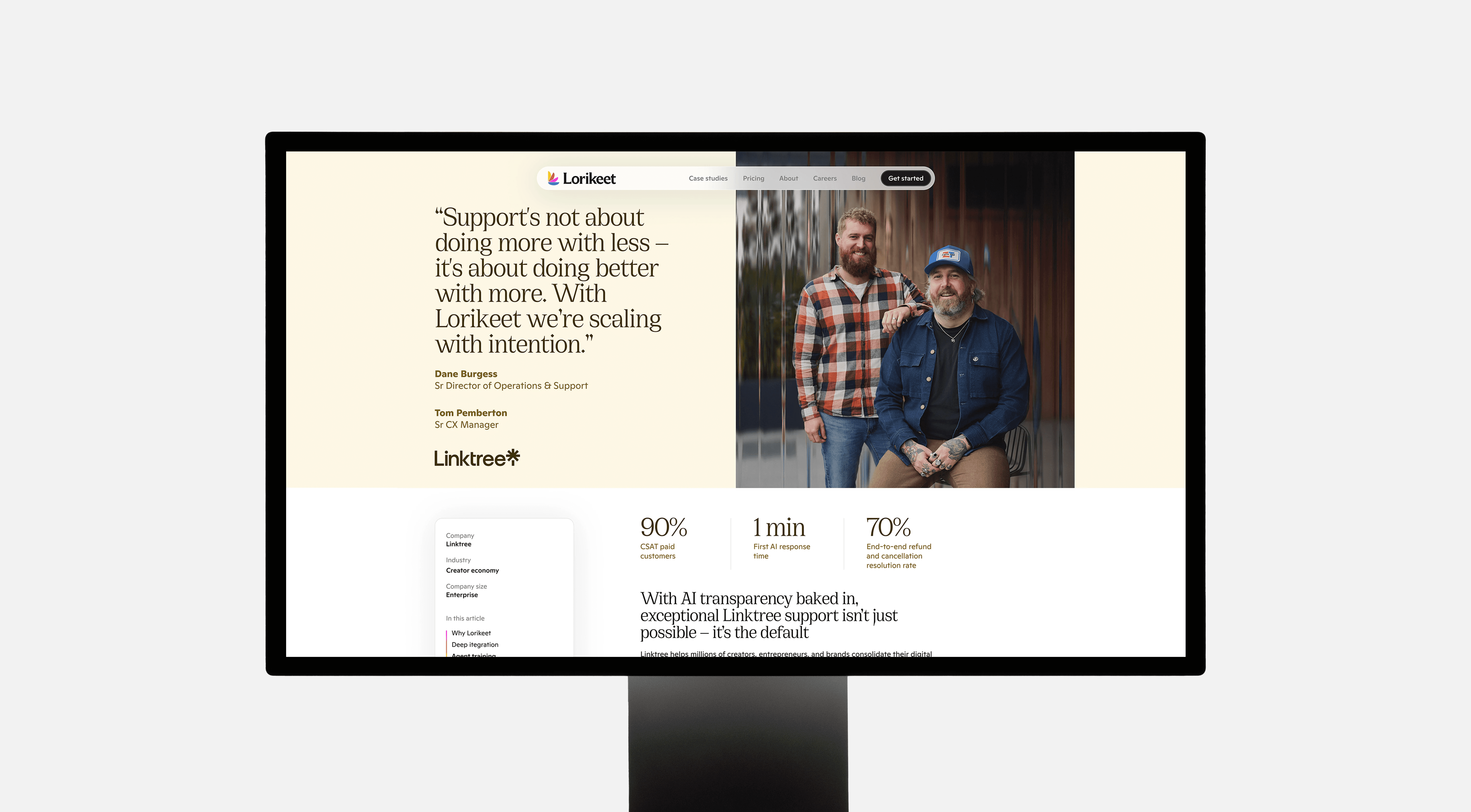 We repositioned Lorikeet to stand for precision over volume—for companies where quality matters and mistakes are costly. The new brand doesn't shout. It proves. We redesigned the visual identity, rebuilt the homepage as an interactive demonstration of the product's intelligence, and launched a customer story hub that shows Lorikeet's difference in action.